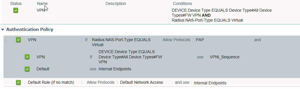 PS Name: null ,Failure: During upgrade of PS: VPN , Got error: Failed to create authentication rule VPN of new Policy Set VPN – VPN