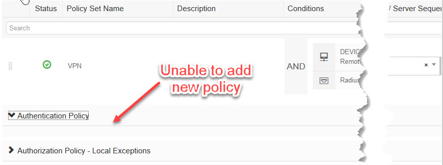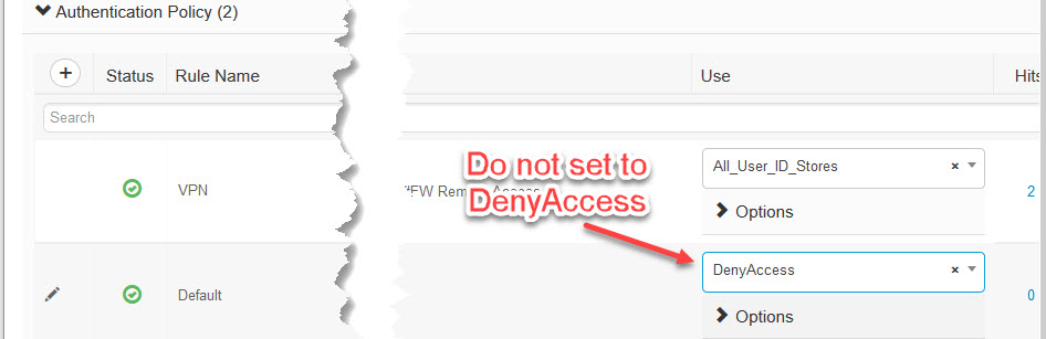 When I thought I was done I went back to VPN policy to change it back to original setup and hit a nasty bug. I’ve added missing authentication rules and changed the Authentication Policy Default to “Deny Access” and lost the ability to make changes to it.